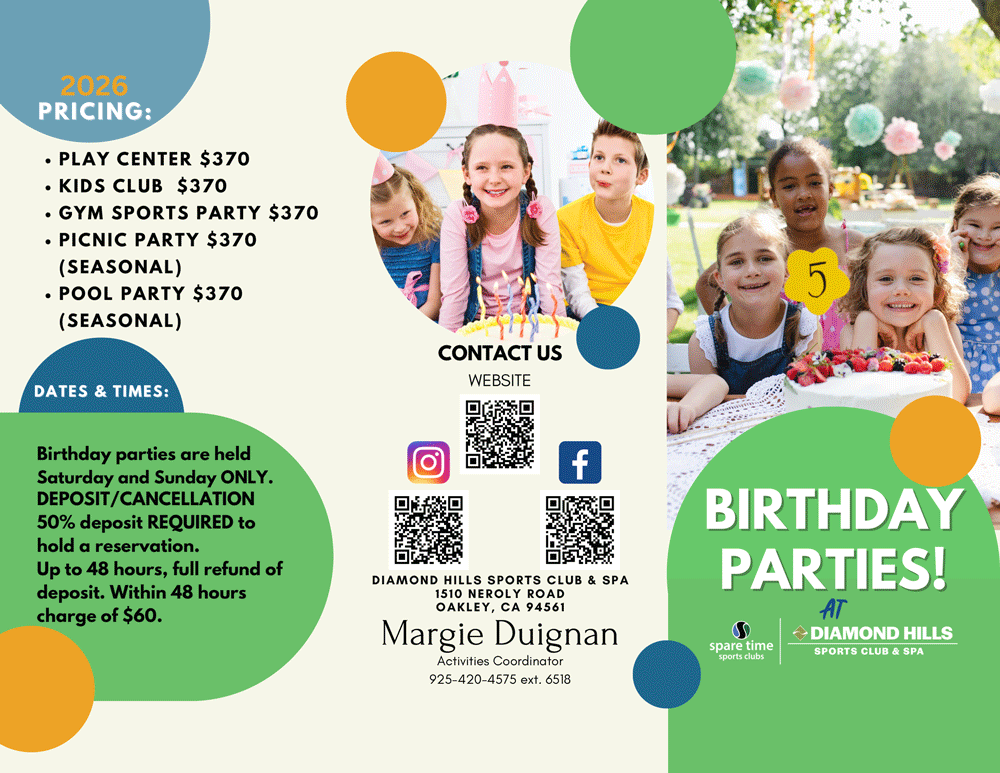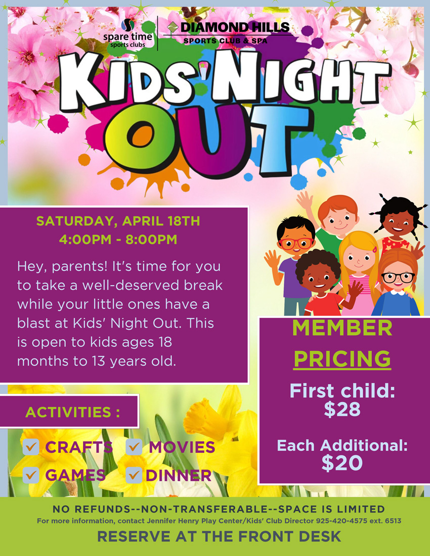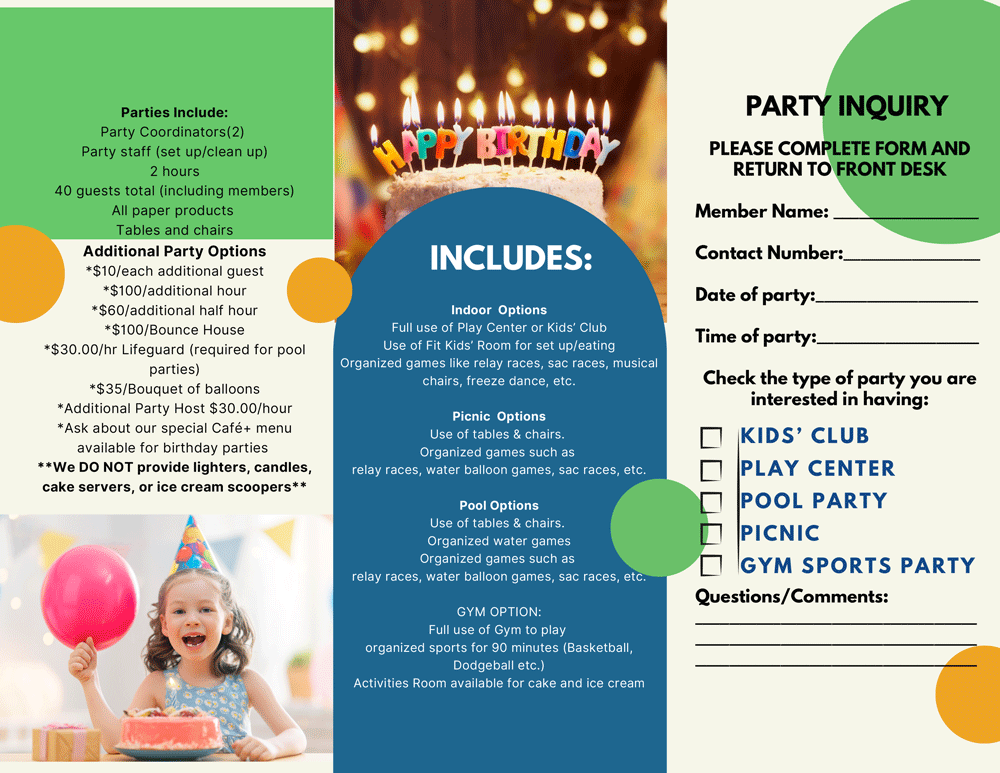 SPECIAL EVENTS/KIDS’ NIGHT OUT Click to download brochure CREATIVE: Fun Friday, Story Time, Billiards, Art, and more FITNESS: Junior Fitness, Basketball, Junior Tennis, Rock Climbing, & more Click to download brochure KIDS’ CLUB & PLAYER CENTER HOURS: Special Hours PARTY FLYER Click to download brochure Elevate Your Fitness Journey Today Contact Us