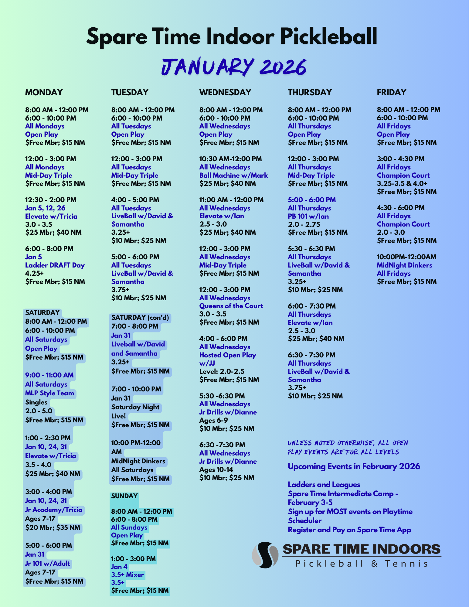 Spare Time Indoors offers the area’s most extensive pickleball programs and activities.
